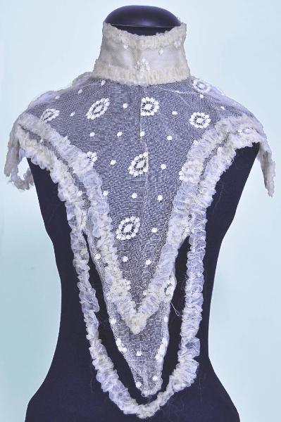 Plastron in merletto meccanico avorio, con fondo a rete a maglie quadre con pois e corolle stilizzate ovali poste a rada scacchiera. Doppiato in crespo avorio, che costituisce due giri di ruches arricciate lungo i bordi e sul collo. Sagomato a quattro punte, due più lunghe che scendono sul davanti e sul dietro fino al punto vita; due più corte si dispongono sulle spalle. Collo alto con tre stecche, foderato in raso avorio. Apertura posteriore chiusa da ganci.