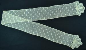 Barba per acconciatura o cravatta femminile in tulle bianco, fondo bobbinet con ricamo meccanico. Estremità stondate con motivo di semicorolla o grande foglia, sul fondo scacchiera di piccole melagrane. Bordi a piccoli smerli.