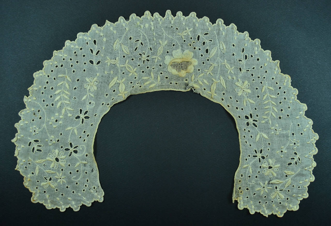 Collo piatto in un pezzo, in tela avorio ricamata ad ago con filo nello stesso tono, a p. erba, pieno, inglese, ombra. Decoro a steli sparsi con foglie e fiori e piccoli pois forati. Rifinito a piccoli smerli trilobati profilati a p. asola, come il margine interno.