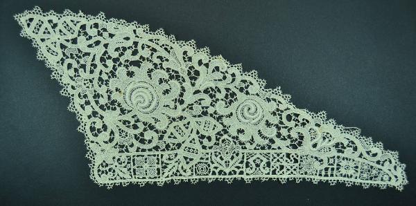 Parte di collo (risvolto?) in cotone bianco. Lavorato con macchina Schiffli e metodo chimico, ad imitazione del p. Venezia a rilievo. Grandi corolle circondate da fitti girali e foglie. Sul bordo esterno bande a motivi geometrici ad imitazione di reticello.