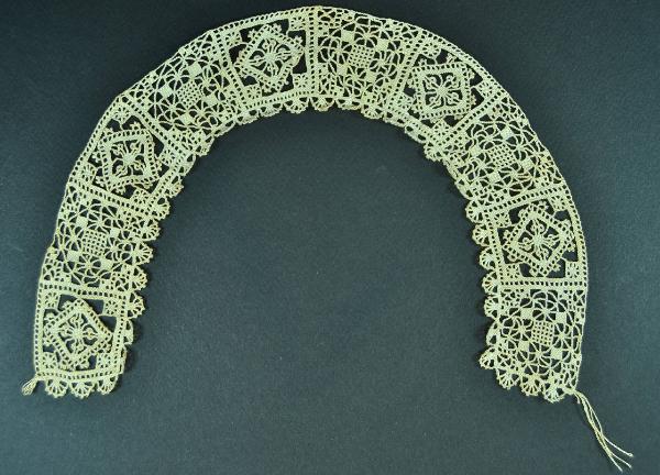 Collo in lino avorio, a puncetto lavorato ad ago. In collo è realizzatomettendo in formamediante spillatura un bordo lineare, ad elementi quadrati alternati con due diversi decori geometrici. Su tre lati piccoli smerli a raggera.