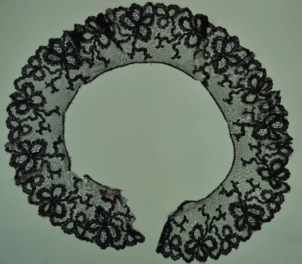 Ampia gala per scollatura di abito femminile (berta), in merletto meccanico nero con fondo in tulle bobbinet. Decoro a fiocchi con cocche a riempimenti geometrici e nastri svolazzanti. Bordo esterno smerlato, bordo interno a perlinatura.