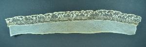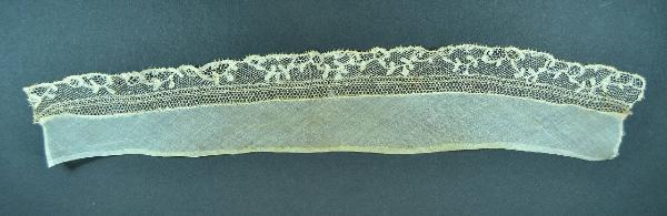Collo a cinturino, in tela di cotone in scieco, profilato da ruche in sottilissimo merletto avorio tipo applications de bruxelles, con fondo a rete drochel e motivi minuti, anche applicati, a p. tela con riempimenti ad ago. Il merletto ha un alto piede a due bande a p. de Paris.