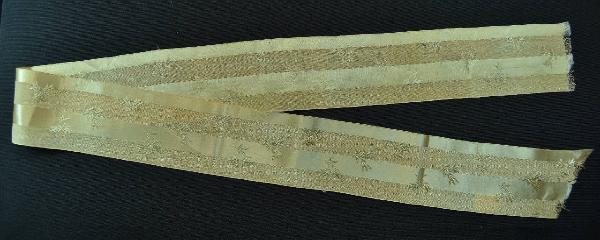 Gala per ampia scollatura di abito nuziale femminile, in merletto avorio in tulle bobbinet e ricamo meccanico, a p. catenella tipo tambour work. Decoro dato da un sottile nastro con picot che si snoda lungo il bordo smerlato formando fiocchi quadrettati che legano steli con fiori a stella; pois sul fondo. È conservato in una scatola di cartone insieme ad un alto nastro in pekin liserè (raso e taffetas) di seta avorio con fiorellini a scacchiera.
