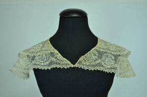 Ampio collo a due baveri, in tulle di cotone bobbinet ricamato meccanico. Decoro lungo i bordi a festoni resi da tralcio di sottili foglie bipennate che include nell'ansa una larga foglia a sette punte con interno a motivi geometrici. Margini a puntine con perlinatura. Nel bavero più piccolo il decoro è ridimensionato.