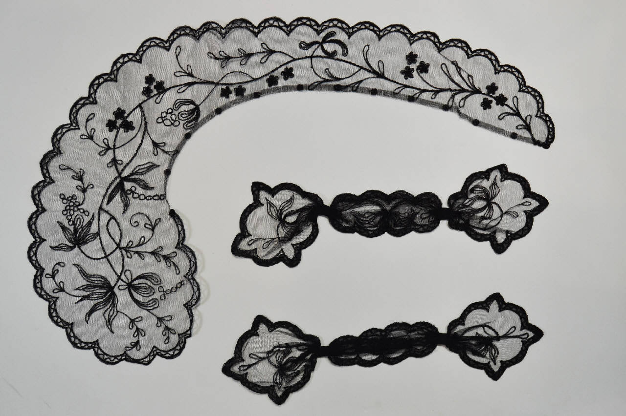 Parure nera composta da collo e polsini per abito femminile, in tulle bobbinet meccanico, a ricamo meccanico tipo tambour work in fili di seta nera a due spessori. Collo in un pezzo, asimmetrico, con un'estremità allargata e una più sottile. decorato da tralcio ondulante con foglie e fiorellini, che termina nella parte larga con corolla aperta tipo tulipano e grappoli di bacche. Bordo esterno smerlato con cornice a zig-zag. Automatici nel bordo interno per fissarlo allo scollo. I polsini sono confezionati con una banda rettangolare del tulle ricamato, smerlata e con estremità lobate, ristretta subito prima delle estremità da passanti in tulle nei quali, all'interno, sono gli automatici per la chiusura.