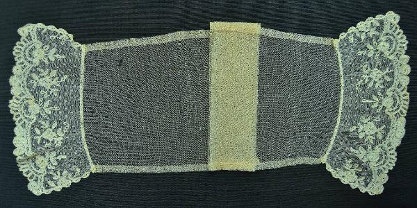 Sciarpa o cravatta in tulle meccanio avorio senza decoro (maglie esagonali a due fili con i due lati verticali ritorti). Alle estremità sono cucite due bande di merletto avorio tipo applications de Bruxelles, con fondo in tulle bobbinet meccanico su cui sono applicati motivi a fuselli, a p. tela con filo di traccia più spesso lungo i profili. Decoro ad ampi smerli resi da volute a C con foglie sul fondo, alternate a nastro decorato a zig-zag profilato da tre fiori; nelle anse fiori con foglie e bacche. Sul fondo piccoli pois.