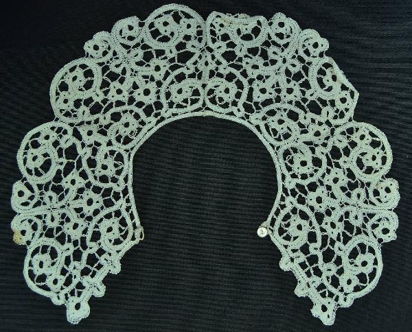 Collo piatto a fuselli, in lino bianco a nastrino continuo con bordi traforati, fondo a doppie barrette a treccia con picot. Decoro dato da steli desinenti in tre trifogli, inclusi da volute a S terminanti con trifogli che formano gli smrli del bordo esterno. Chiuso al bordo scollo da bottoncino di madreperla.