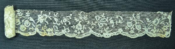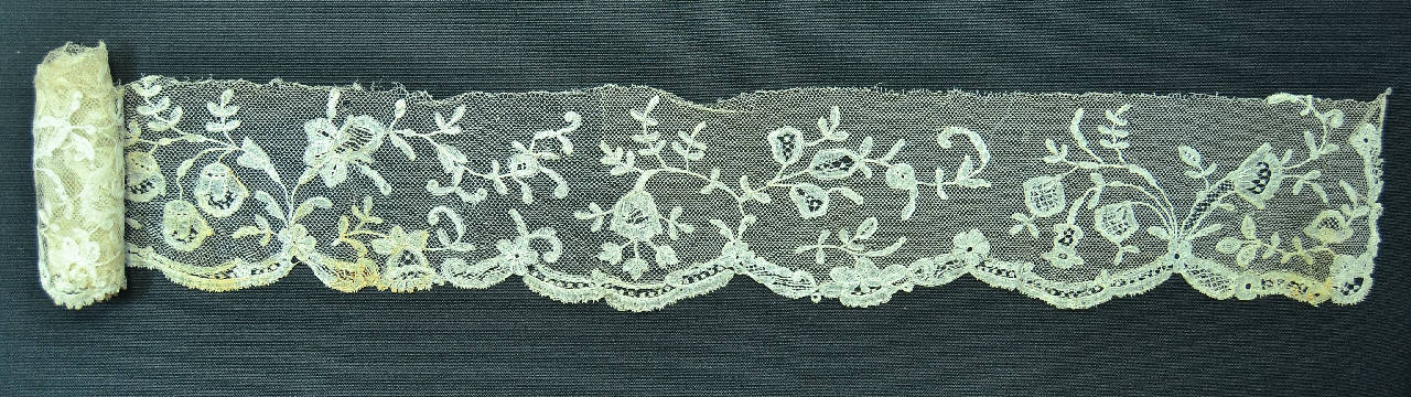 Bordo in merletto tipo applications de Bruxelles. Fondo a rete tipi Lille (a fuselli?), motivi realizzati a fuselli, in lino a fili continui a p. tela e bordi in rilievo con raggruppamento di fili e con filo di traccia inserito durante la lavorazione. I motivi sono poi applicati a cucito con riempimenti ad ago. Le applicazioni definiscono tre lati del bordo, creando una morbida smerlatura; il quarto lato è tagliato. La rete di fondo mostra giunzioni, inserti di reti analoghe e numerosi finissimi interventi di riparazione.ùDecoro simmetrico rispetto al centro, dato da steli arcuati nascenti dal bordo con fiori, boccioli, foglie; bordo profilato da nastro ad affetto pizzo, intervallato da corolle.