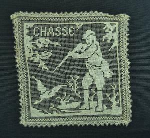 Elemento quadrato in lino naturale a rete filet ricamato a p. tela. All'interno di una cornice quadrettata un cacciatore spara ad un'anatra, in ambiente paludoso con zolle e piante. In alto a sinistra è ricamata la parola "CHASSE". Stretto bordo a fuselli tipo torchon, ad archetti con picot, cucito ai margini del quadrato a filet.