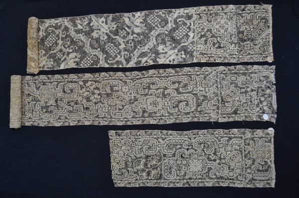 Tre pezzi di bordo a filet in lino naturale, ricamato a p. tela, rammendo e piatto con filo di lino naturale in due toni nocciola. Disegno dato da robusto ramo nodoso, ondulante, con decoro interno geometrico sempre variato. Nei punti di cambio di direzione il tronco è stretto da nodi ad anello: sopra e sotto il nodo si dipartono grandio bocci tipo acanto che si dispongono verso l'alto e verso il basso nelle anse. Dal tronco si generano sottili steli con fiori diversi tipo gigli, caprifogli, iris e altri. Lungo i bordi, delimitati da cornice lineare a blocchi alternati fitti e radi, si rincorrono rametti con foglia a semipalmetta e con melagrana o bocciolo.\nIl frammento f è formato da un bordo nella stessa tecnica e diverso decoro (tralci di vite con foglie e grappoli) a cui sono cuciti pezzi dello stesso bordo a e b.