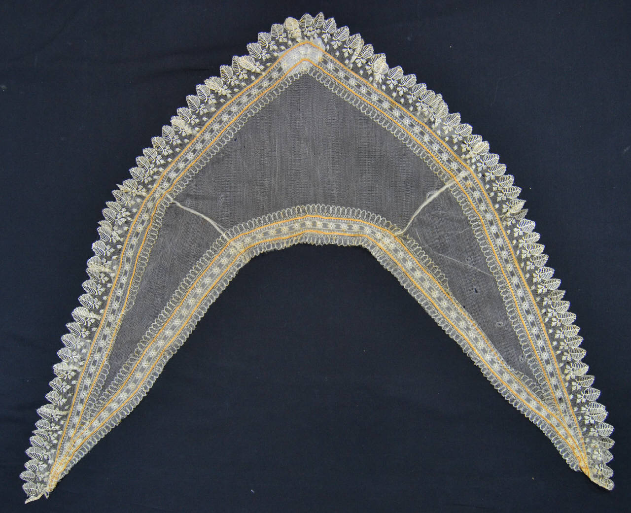 Collo-fichu triangolare, con lunghe punte da incrociare sul petto, sagomato sulle spalle mediante taglio, in tulle bobbinet meccanico di seta avorio, con motivi ricamati e profilati con filo di traccia più spesso. Profilato nel lato interno da merletto in tulle analogo ricamato con smerli su due lati. Lungo gli altri due lati due giri dello stesso merletto, con smerli solo nel bordo interno; lungo quello esterno è applicata una gala nello stesso tulle ricamato con motivi di foglie e boccioli che definiscono smerli accentuati. Sulle cuciture che fermano i merletti è cucita una trecciolina color senape.