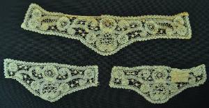Parure composta da collo e polsini o patte per tasche, confezionati con merletto rinascimento, realizzato con nastrino meccanico con bordi traforati e stretto bordino smerlato in lino naturale, disposti a formare motivi e bordi, uniti ad ago da barrette in nastrino meccanico. Collo ad alto cinturino con sagomatura più lunga sul davanti, apertura posteriore della cui chiusura rimane un'asola ad ago nell'angolo superiore. I polsini/patte riprendono la forma sagomata. Decoro a volute e rosoni speculari rispetto ad un motivo ovale centrale con riempitivo geometrico.