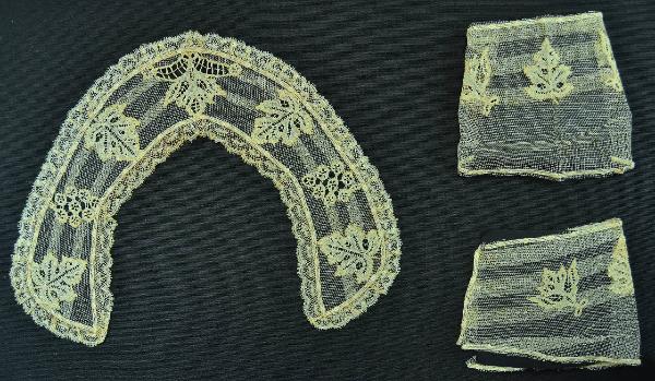Parure composta da collo e polsini in merletto tipo applications de Bruxelles avorio. Fondo in tulle bobbinet meccanico a maglie romboidali, con applicazioni a fuselli, a fili continui a p. tela con barrette a treccia e lungo i margini filo di traccia. Collo piatto stondato e polsini decorati da pieghe lungitudinali sopra le quali sono applicati gli elementi a fuselli. Collo profilato da merlettino a fuselli; collo e polsini presentano lungo i bordi esile passamaneria avorio con motivo a zig-zag e foglioline rilevate.