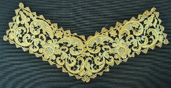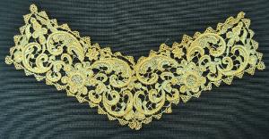Decorazione per collo, a forma di larga V formato da due bande unite al centro in merletto di lino naturale, ad ago a p. Venezia a rilievo. Fondo a barrette a p. festone, con picot, archetti con picot e anellini con picot negli incroci a quattro. Decoro a p. festone e varianti che formano retini; rilievi applicati in vari spessori, decorato da picot e archetti, anche a più giri, con picot. Decoro simmetrico, originato da un medaglione circolare circondato da piccole volute dal quale si dipartono, in alto e in basso foglie d'acanto arricciate, foglioline, corolle. Bordi profilati da punte triangolari ad archetti con picot, grandi e piccole alternate.