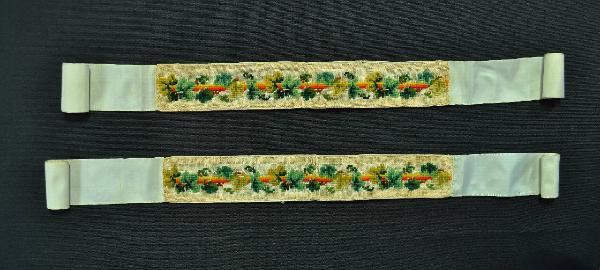 Paio di giarrettiere in rada tela bianca, ricamata a p. croce in cotone (o lana?) policromo, con sottile cornice giallo e arancio a cui si avvolge tralcio di edera. La tela ricamata èprofilata da nastrino in taffetas avorio e doppiata da un alto nastro avorio che, prolungandosi sui lati serve a stringere la giarrettiera alla gamba.