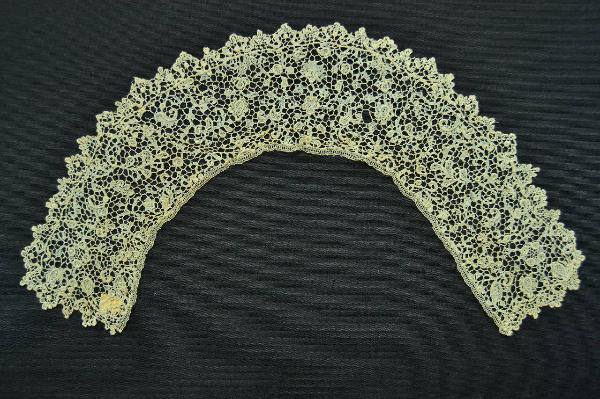 Collo piatto in lino naturale, in cinque pezzi di merletto ad ago cuciti insieme. Eseguiti tutti con la tecnica del punto corallino, con fondo a maglie esagonali irregolari a p. festone, con picot. Decori a p. festone con varianti che creano trafori; rilievi applicati rivestiti a p. festone, in rari casi con picot. Bordo su tre lati, in parte lavorato insieme e in buona parte cucito al margine, a smerli alternativamente trilobati e pentalobati. Nel bordo scollo piede a fuselli cucito successivamente.\nSul fondo irregolare steli labirintici con foglioline, piccoli fiori, boccioli. I pezzi presentano decori analoghi, anche se non riconducibili esattamente ad un unico pizzo originario.