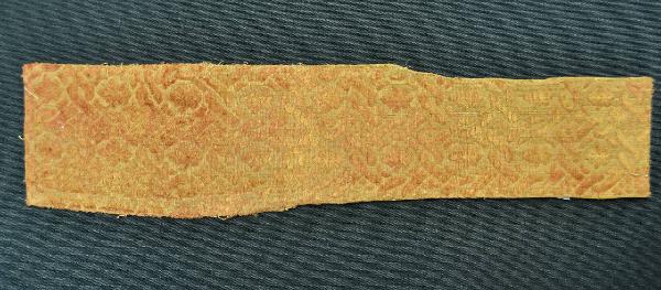 Lungo frammento rettangolare color nocciola rosato, costituente parte di manipolo, con margini verticali ripiegati all'interno, con tracce di cuciture; in uno dei margini è presente un tratto di cimosa. Velluto cesellato, in seta originariamente rossa, con fondo in taffetas doublè (1 ordito di pelo/3 orditi di fondo; 3 colpi al ferro); cimosa destra in taffetas con cordella. Decoro dato dal velluto tagliato, con sottili profili in velluto riccio. Motivo a piccole maglie romboidali a doppia cornice, in teorie concatenate tra loro in orizzontale e in verticale: al centro minuto giglio stilizzato con due foglie. Tra le maglie piccola croce.