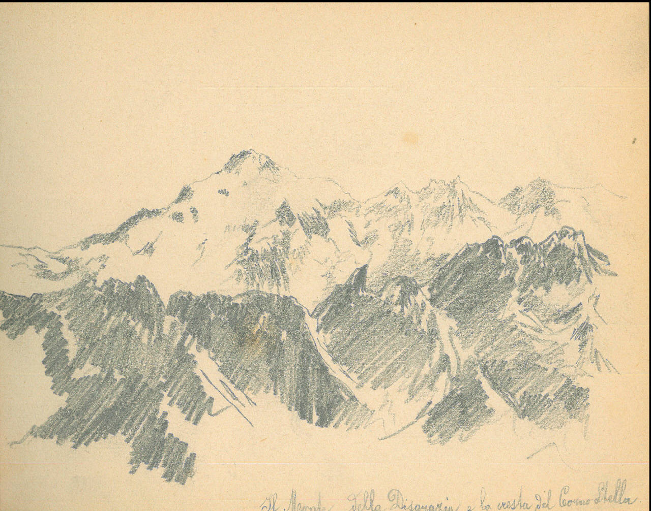 - NOTIZIE STORICO CRITICHE Serie di disegni conservati all'interno di un taccuino da viaggio datato 1892 e posseduto dall'artista Camillo Ghisi.\nPaesaggio montano rappresentante Il Monte della Disgrazia e la cresta del Corno Stella