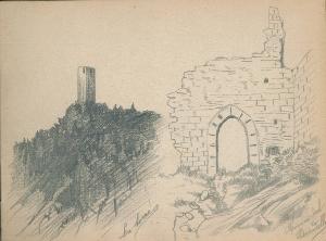 - NOTIZIE STORICO CRITICHE Serie di disegni conservati all'interno di un taccuino da viaggio datato 1892 e posseduto dall'artista Camillo Ghisi.\nVeduta della Torre del Baradello ed un particolare delle rovine.
