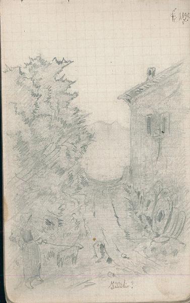 - NOTIZIE STORICO CRITICHE Serie di disegni conservati all'interno di un taccuino da viaggio posseduto dall'artista Camillo Ghisi.\nSchizzo a matita di una scena paesaggistica montana con una abitazione sulla destra ed una figura femminile in abiti tradizionali con il proprio cagnolino sulla sinistra.