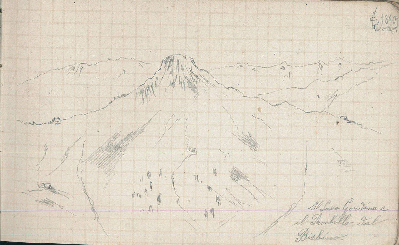 - NOTIZIE STORICO CRITICHE Serie di disegni conservati all'interno di un taccuino da viaggio posseduto dall'artista Camillo Ghisi.\nSchizzo a matita del Sasso Gordona e il Prabello dal Bisibino.