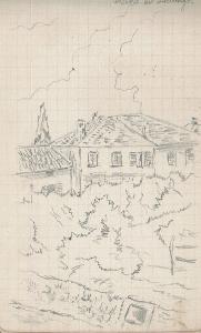 - NOTIZIE STORICO CRITICHE Serie di disegni conservati all'interno di un taccuino da viaggio posseduto dall'artista Camillo Ghisi.\nSchizzo a matita del di una abitazione seminascosta da della vegetazione nel paese comasco di Inverigo.