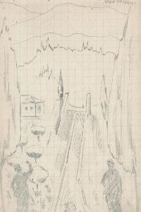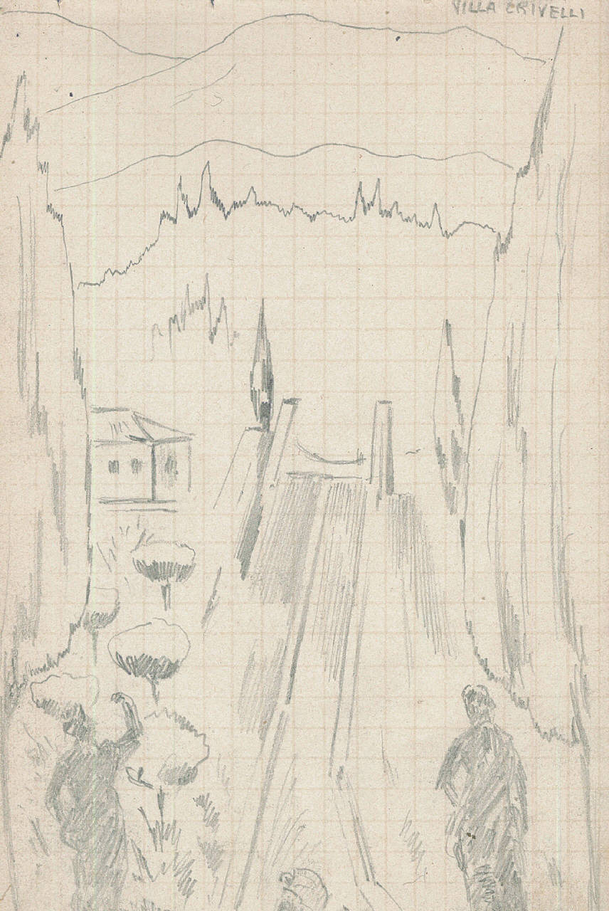- NOTIZIE STORICO CRITICHE Serie di disegni conservati all'interno di un taccuino da viaggio posseduto dall'artista Camillo Ghisi.\nSchizzo a matita dei giardini di Villa Crivelli con due elementi statuari di gusto classico. Sono riconoscibili anche due figure umane viste di spalle: una donna ed un bambino.