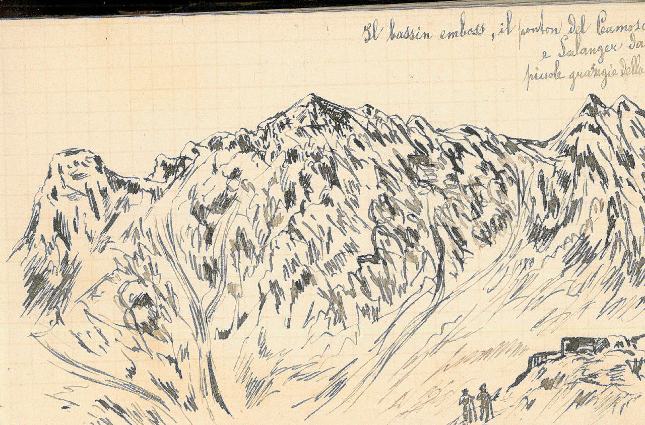- NOTIZIE STORICO CRITICHE Serie di disegni conservati all'interno di un taccuino da viaggio posseduto dall'artista Camillo Ghisi.\nSchizzo ad inchiostro raffigurante Il bassin emboss, il ponton del Camoscio e Salanger dalle piccole grangie della Finestra con due figure maschili viste di spalle nella parte bassa del disegno.