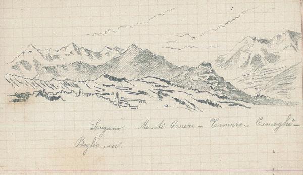 - NOTIZIE STORICO CRITICHE Serie di disegni conservati all'interno di un taccuino da viaggio posseduto dall'artista Camillo Ghisi\nSchizzo a matita raffigurante la città di Lugano e sullo sfondo i Monti Conere,Tamaro, Camoghè e Boglia, ecc.