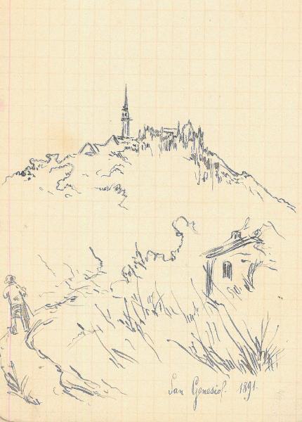 - NOTIZIE STORICO CRITICHE Serie di disegni conservati all'interno di un taccuino da viaggio posseduto dall'artista Camillo Ghisi\nSchizzo ad inchiostro raffigurante la Chiesa con il suo campanile nel comune di San Genesio in provincia di Bolzano.
