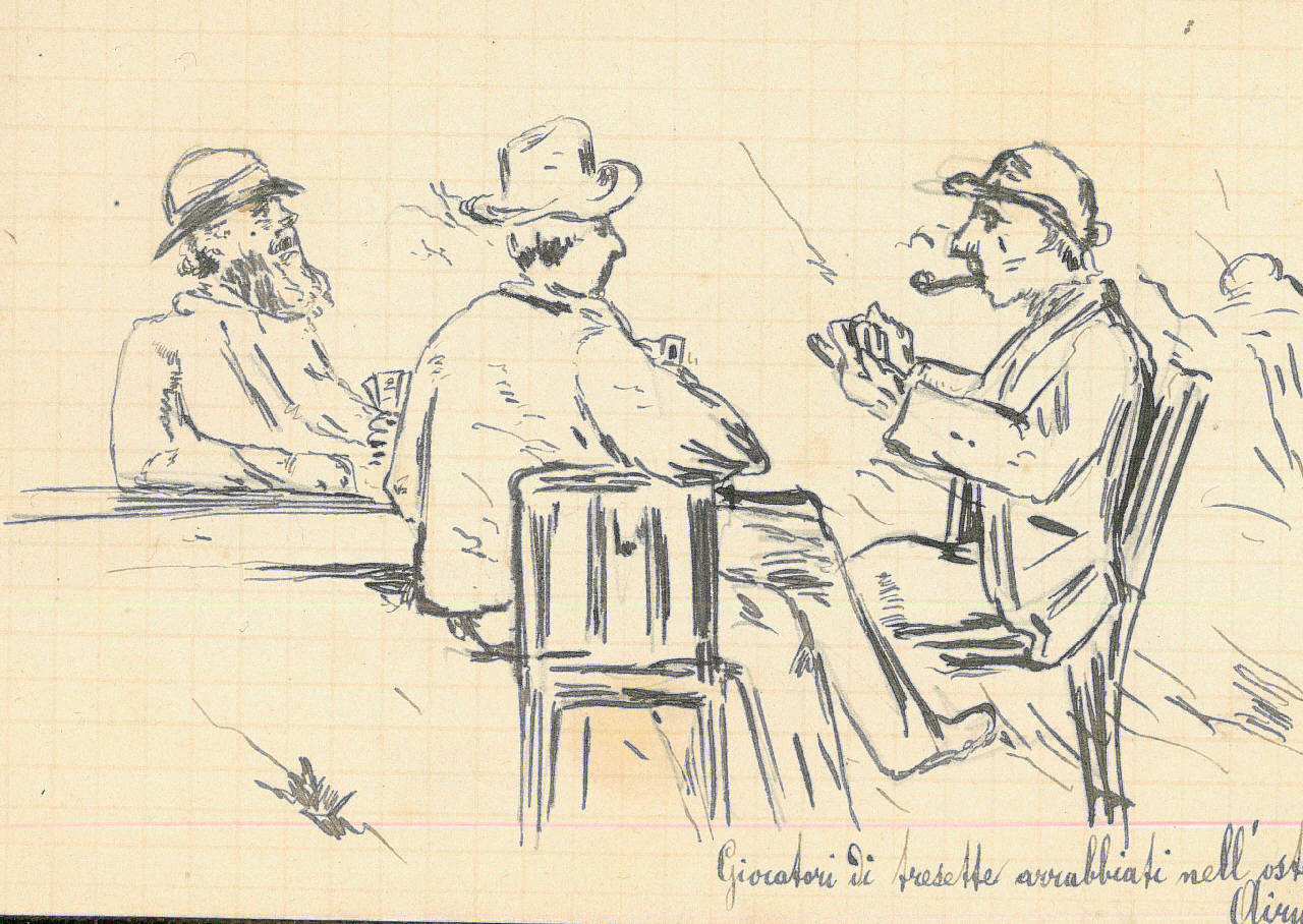 - NOTIZIE STORICO CRITICHE Serie di disegni conservati all'interno di un taccuino da viaggio posseduto dall'artista Camillo Ghisi\nSchizzo ad inchiostro raffigurante tre figure maschili mentre giocano al tradizionale gioco di carte tresette nell'osteria di Airuno (Lecco).