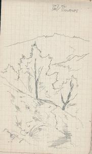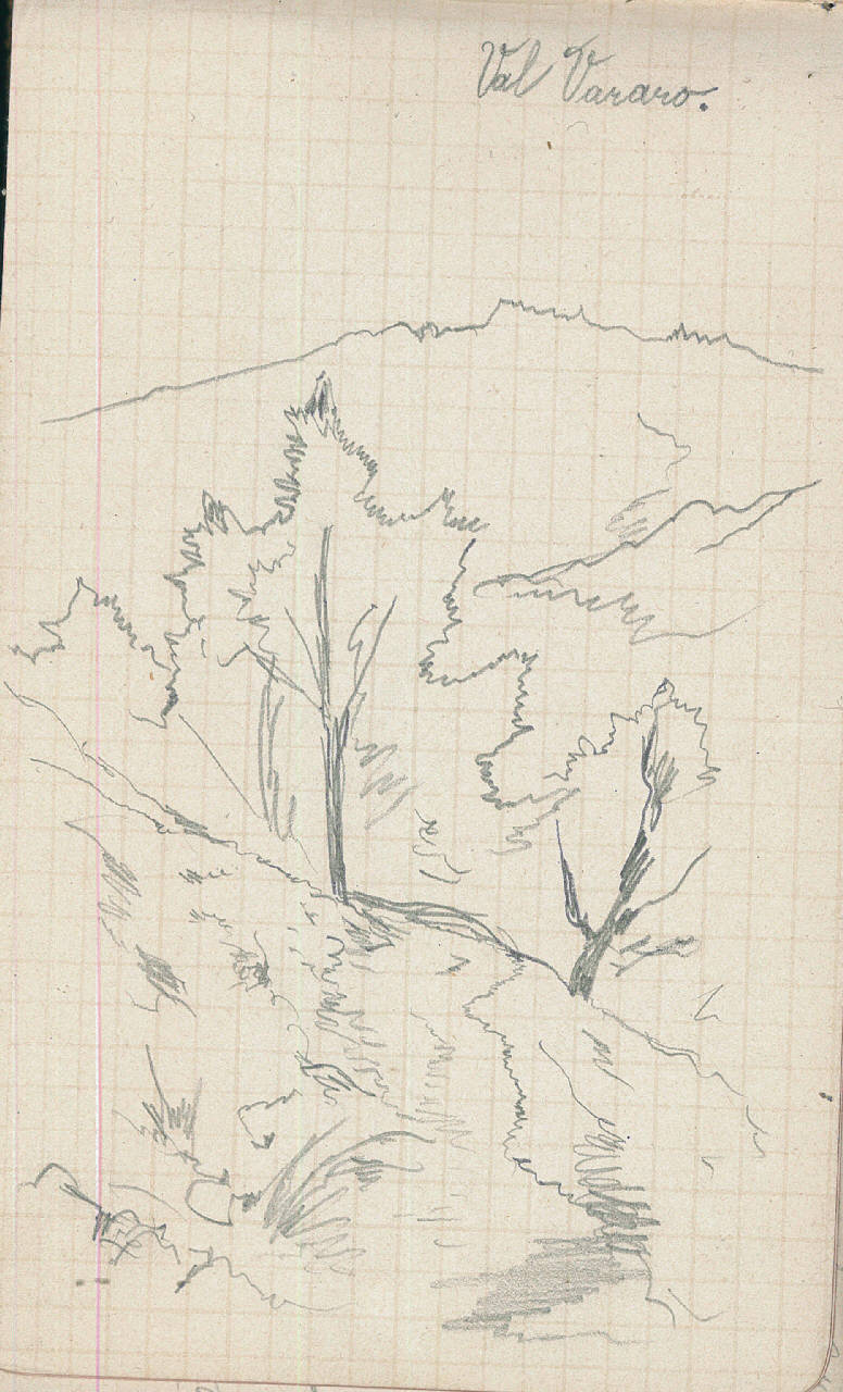 - NOTIZIE STORICO CRITICHE Serie di disegni conservati all'interno di un taccuino da viaggio posseduto dall'artista Camillo Ghisi\nSchizzo a matita raffigurante Val Vararo.