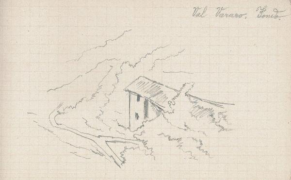 - NOTIZIE STORICO CRITICHE Serie di disegni conservati all'interno di un taccuino da viaggio posseduto dall'artista Camillo Ghisi\nSchizzo a matita raffigurante un forno nella Val Vararo.