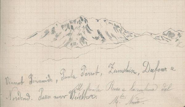 - NOTIZIE STORICO CRITICHE Serie di disegni conservati all'interno di un taccuino da viaggio posseduto dall'artista Camillo Ghisi\nSchizzo a matita raffigurante diverse cime a confine con la Svizzera.