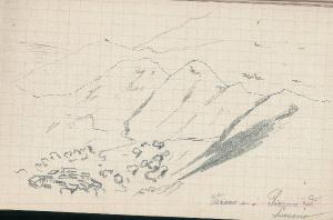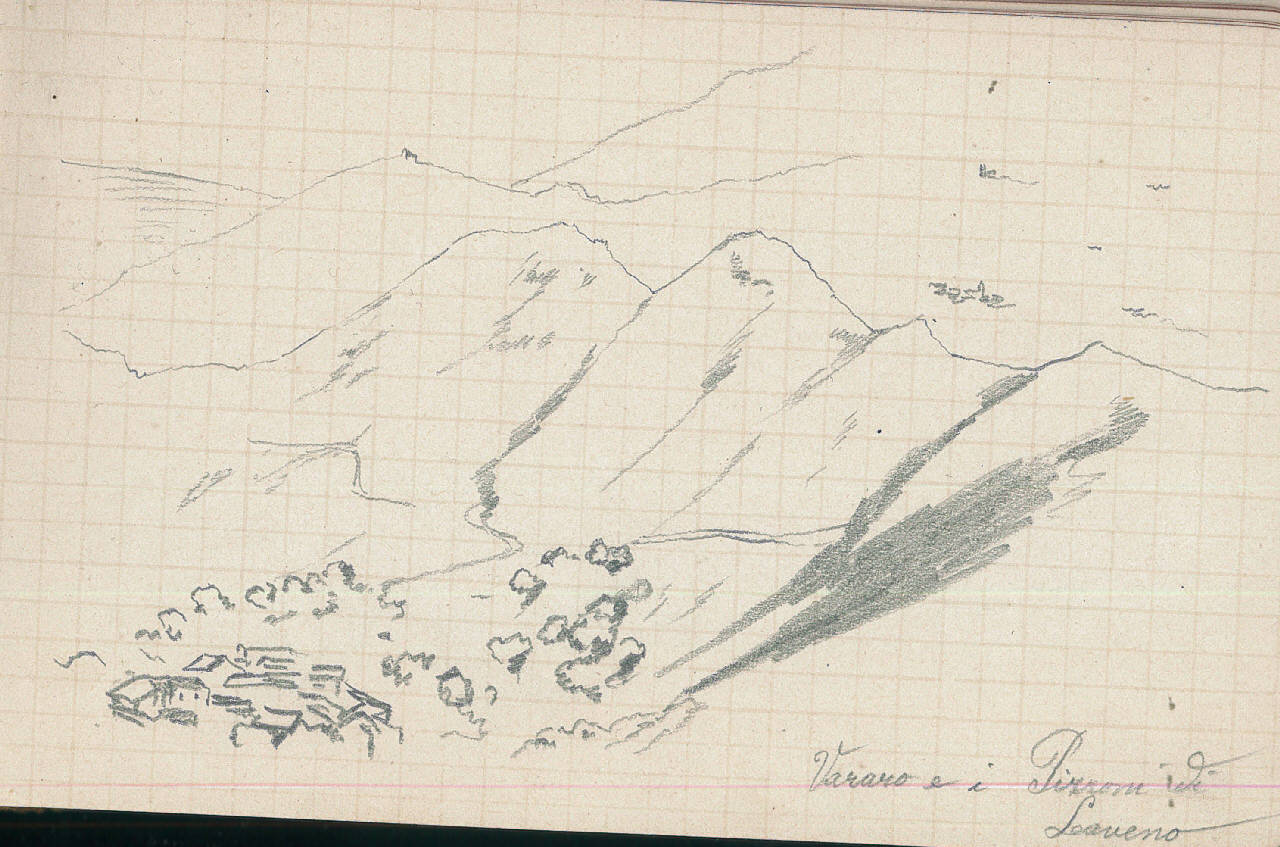 - NOTIZIE STORICO CRITICHE Serie di disegni conservati all'interno di un taccuino da viaggio posseduto dall'artista Camillo Ghisi\nSchizzo a matita raffigurante il comune di Varano e i Pizzoni di Laveno.