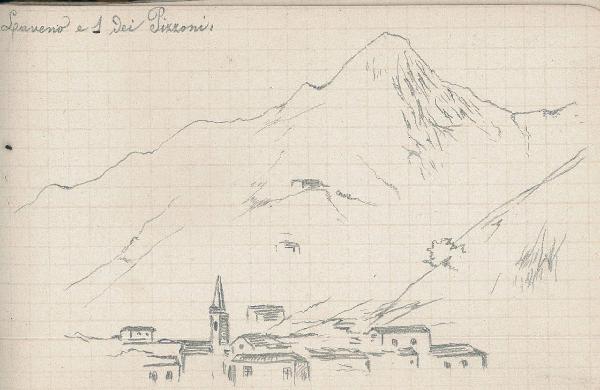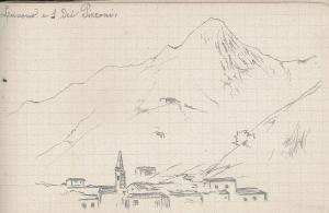 - NOTIZIE STORICO CRITICHE Serie di disegni conservati all'interno di un taccuino da viaggio posseduto dall'artista Camillo Ghisi\nSchizzo a matita raffigurante il paese di Laveno con uno dei suoi Pizzoni.