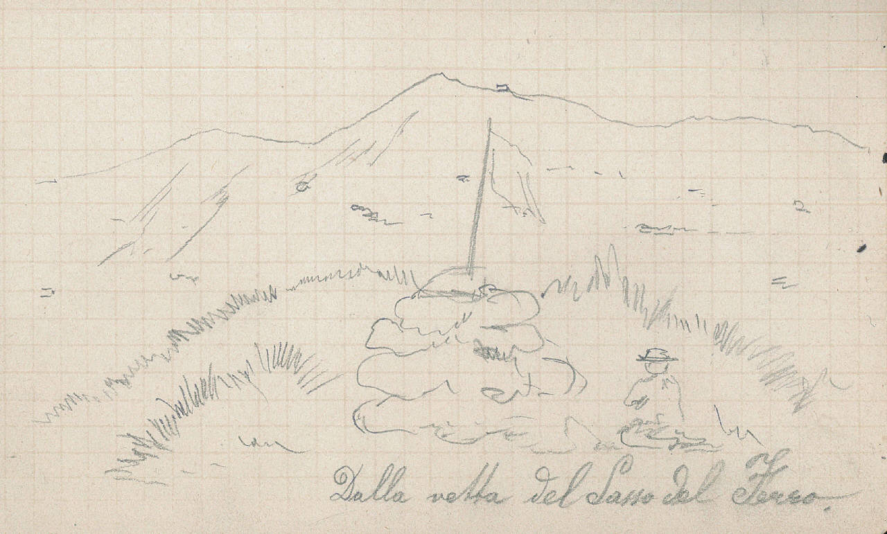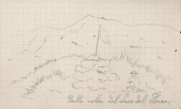 - NOTIZIE STORICO CRITICHE Serie di disegni conservati all'interno di un taccuino da viaggio posseduto dall'artista Camillo Ghisi\nSchizzo a matita raffigurante la vetta del Sasso del Ferro con una figura maschile vista di spalle e seduta.