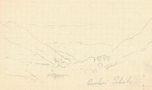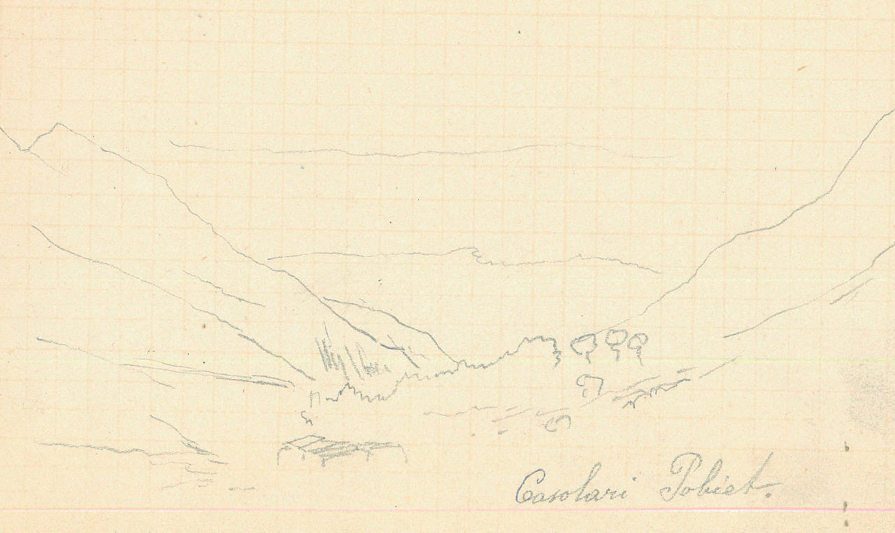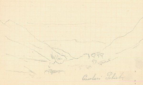 - NOTIZIE STORICO CRITICHE Serie di disegni conservati all'interno di un taccuino da viaggio posseduto dall'artista Camillo Ghisi\nSchizzo a matita raffigurante alcuni Casolari Pobiet.