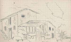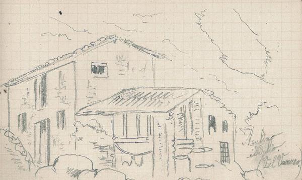 - NOTIZIE STORICO CRITICHE Serie di disegni conservati all'interno di un taccuino da viaggio posseduto dall'artista Camillo Ghisi\nSchizzo a matita raffigurante un mulino in Val Varano.