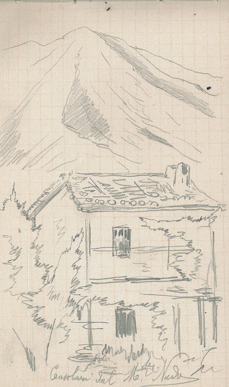 - NOTIZIE STORICO CRITICHE Serie di disegni conservati all'interno di un taccuino da viaggio posseduto dall'artista Camillo Ghisi\nSchizzo a matita raffigurante un casolare visto dal Monte Nudo.