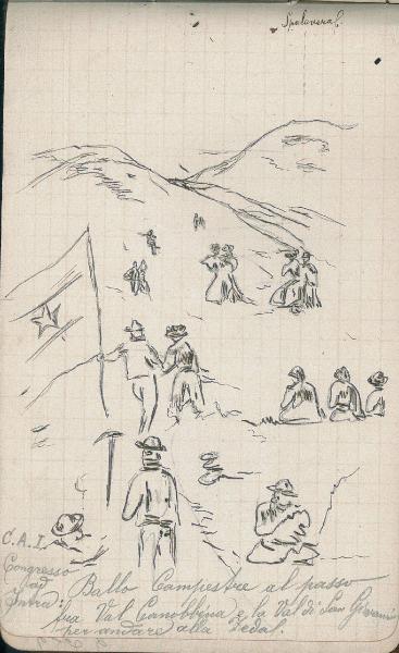 - NOTIZIE STORICO CRITICHE Serie di disegni conservati all'interno di un taccuino da viaggio posseduto dall'artista Camillo Ghisi\nSchizzo a matita raffigurante il ballo Campestre al passo fra la val Canobbina e la Valle di San Giovanni per andare alla Zeda per il Congresso di Intra organizzato dal C.A.I. di cui è riconoscibile la bandiera.