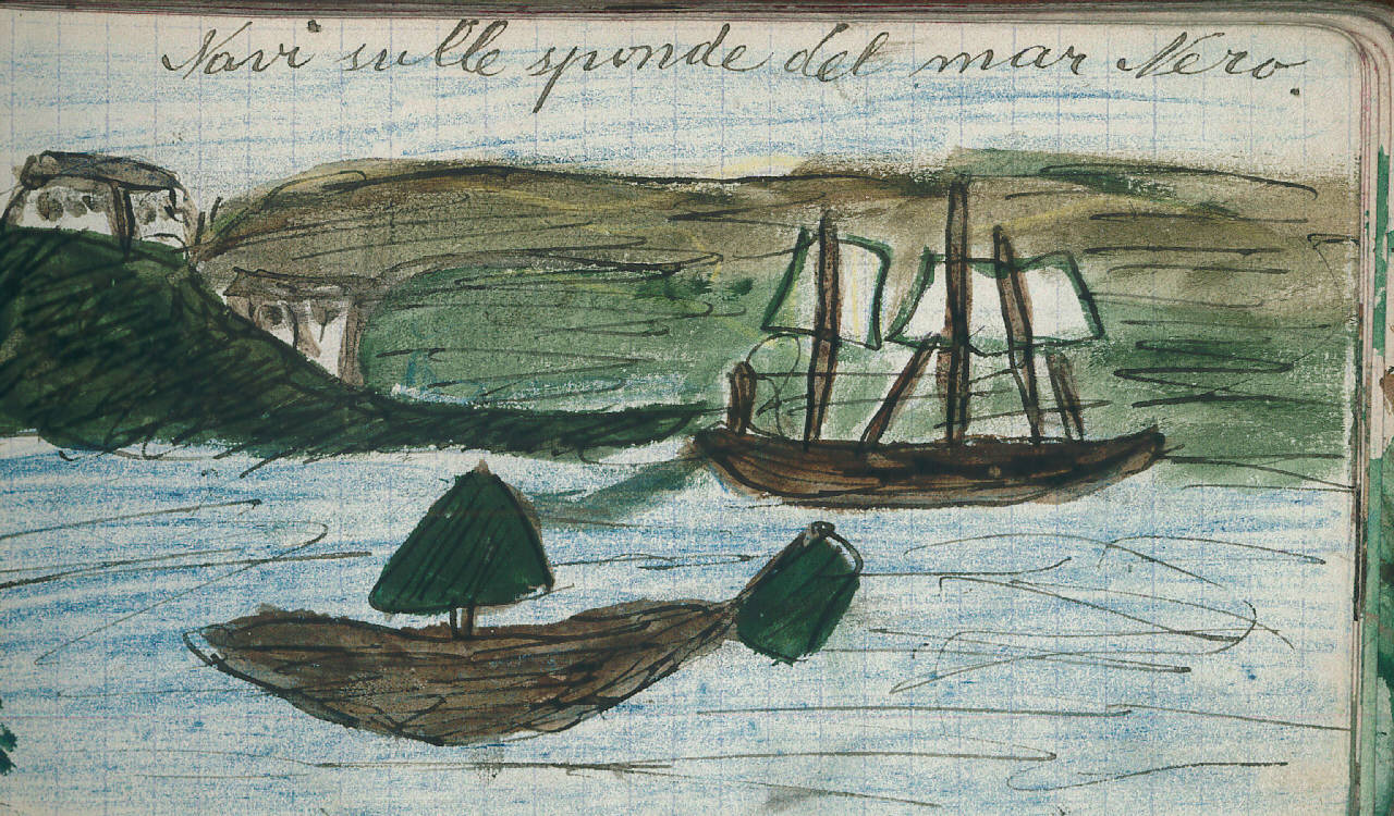 - NOTIZIE STORICO CRITICHE Serie di disegni conservati all'interno di un taccuino posseduto dall'artista Camillo Ghisi.\nScena raffigurante alcuna navi sulle sponde del Mar Nero.