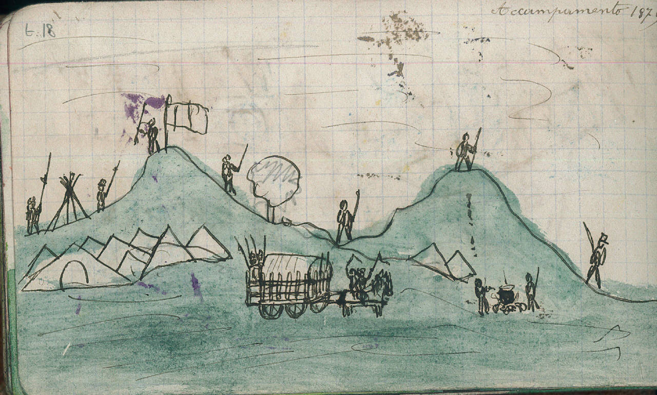 - NOTIZIE STORICO CRITICHE Serie di disegni conservati all'interno di un taccuino posseduto dall'artista Camillo Ghisi.\nScena raffigurante l'accampamento di un esercito nel 1879.