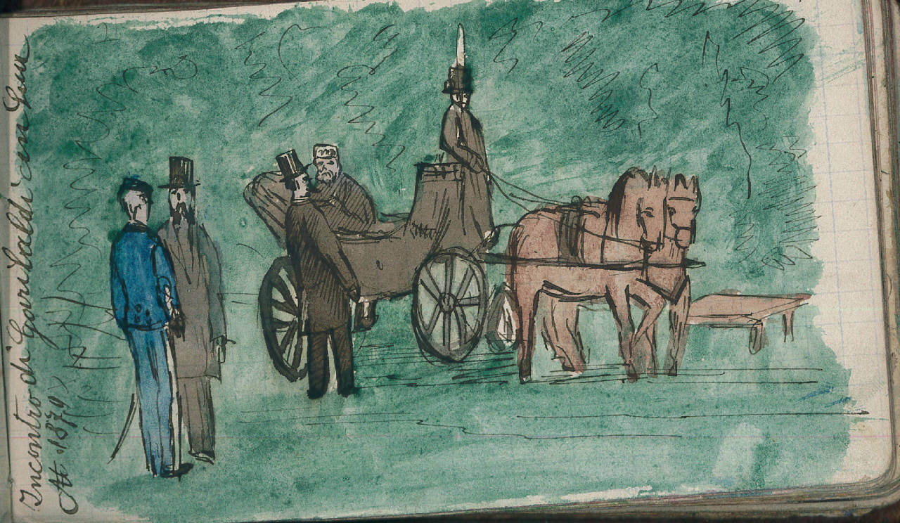 - NOTIZIE STORICO CRITICHE Serie di disegni conservati all'interno di un taccuino posseduto dall'artista Camillo Ghisi.\nScena raffigurante un lo storico incontro tra Garibaldi e sua Maestà Vittorio Emanueòe nel 1879