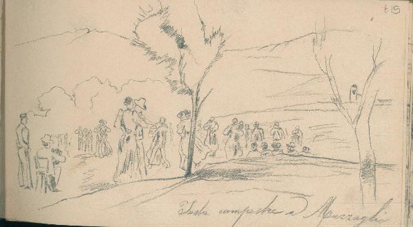 - NOTIZIE STORICO CRITICHE Serie di disegni conservati all'interno di un taccuino posseduto dall'artista Camillo Ghisi. \nIl soggetto raffigura la tradizionale esta campestre a Muzzaglio in Valsolda.\nIl taccuino viene indicato nel registro di carico al n° 34305