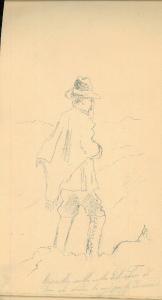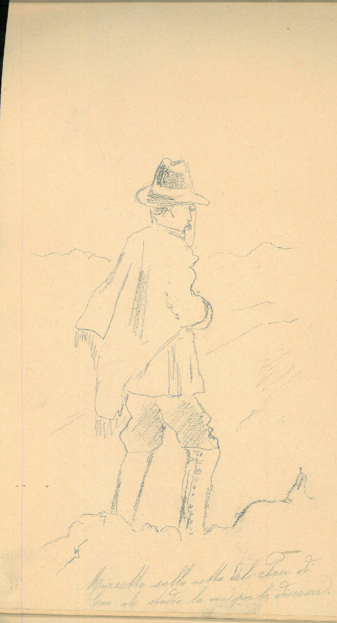 - NOTIZIE STORICO CRITICHE Serie di disegni conservati all'interno di un taccuino posseduto dall'artista Camillo Ghisi. \nIl soggetto raffigura l'amico di Ghisi Mazzaretto sulla vetta del Pizzo di Ghiro che divide la via per la discesa.\nIl taccuino viene indicato nel registro di carico al n° 34305