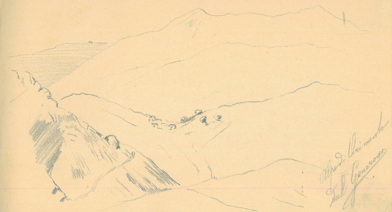 - NOTIZIE STORICO CRITICHE Serie di disegni conservati all'interno di un taccuino posseduto dall'artista Camillo Ghisi. \nIl soggetto raffigura l'Alpe di Orimendo viste dal Generoso.\nIl taccuino viene indicato nel registro di carico al n° 34305