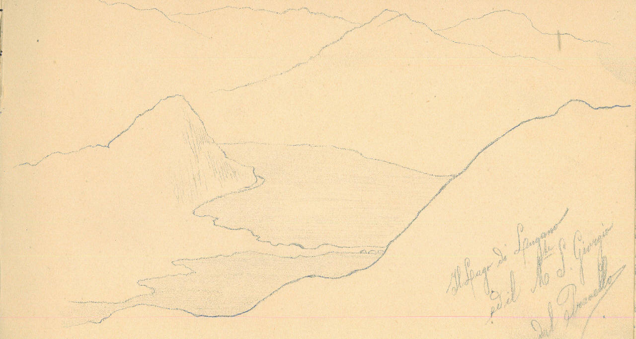 - NOTIZIE STORICO CRITICHE Serie di disegni conservati all'interno di un taccuino posseduto dall'artista Camillo Ghisi. \nIl soggetto raffigura il lago di Lugano ed il M. S. Giorgio dal Pravello.\nIl taccuino viene indicato nel registro di carico al n° 34305