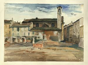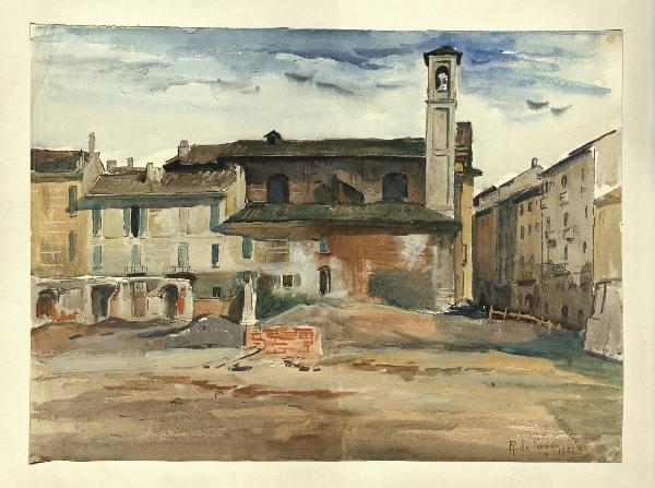 - NOTIZIE STORICO CRITICHE Il dipinto raffigura la chiesa di San Giovanni in Laterano a Milano prima d'essere abbattuta nel 1936. \nSul verso del foglio è indicato il vecchio n. di catalogo del Museo d'Arte Moderna di Milano (GAM 5151).